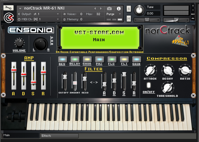 The main tab used for Envelope Amp (ADSR), Filer, Compressor and effects on/off buttons.
